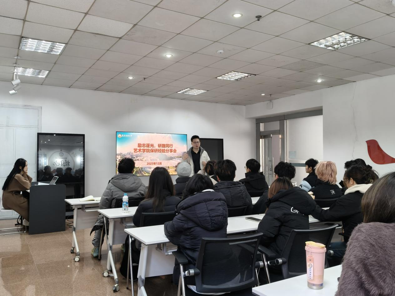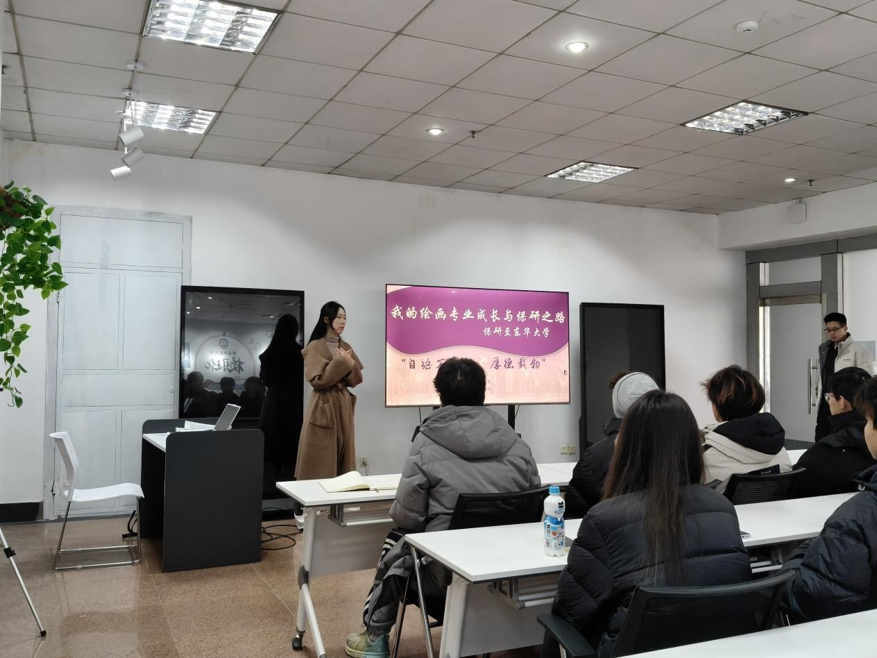 随后,殷昭慧同学分享自身推免经验。她围绕“过四级、冲成绩、备作品集、海投院校、练手绘”五个阶段,细致讲解了艺术类专业保研的实操经验,从英语备考、作品集制作到院校选择与手绘训练,为在场同学提供了清晰可行的参考。