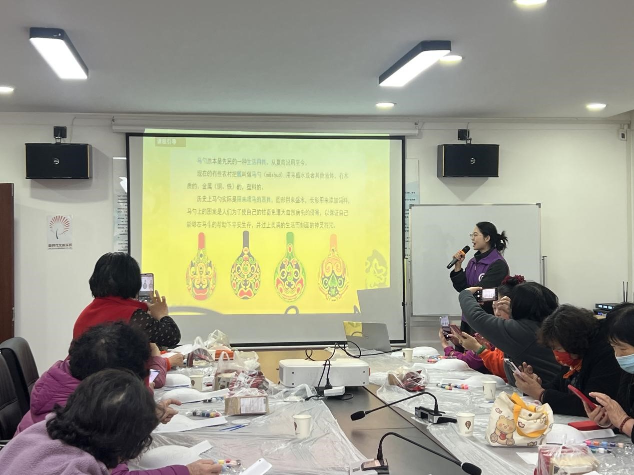 活动现场,“艺术姐姐”团队成员充分发挥专业优势,通过“理论讲解+实践操作”的沉浸式教学模式,为社区居民带来了一场别开生面的非遗体验课。在理论讲解环节,团队成员运用多媒体课件,系统梳理了马勺脸谱的历史渊源、文化内涵及艺术特征,结合陕西凤翔、山西临汾等地的地域特色,生动解析了不同脸谱纹样所代表的人物性格与象征意义。