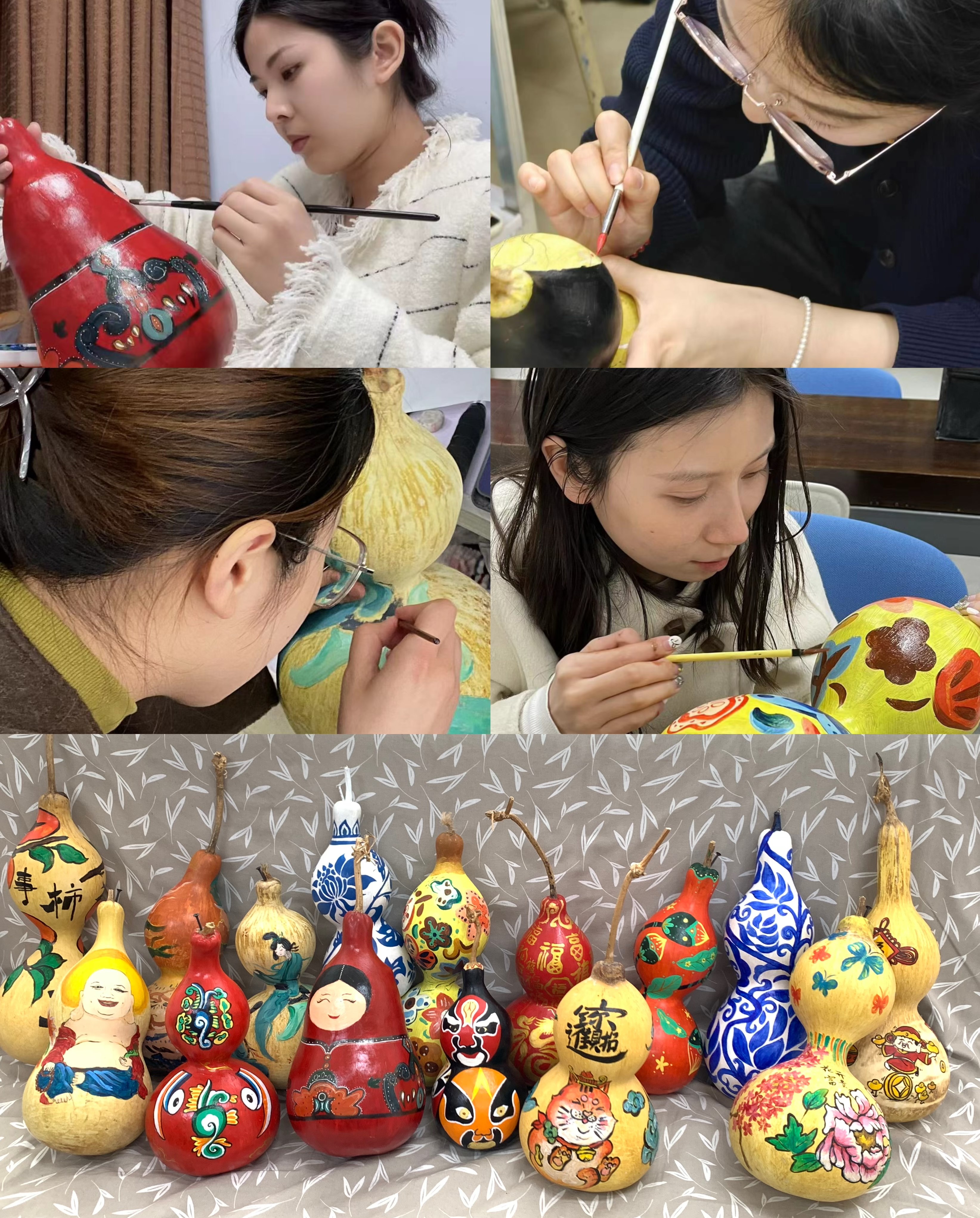 “艺术姐姐”以葫芦为载体,精心构思并进行绘制,她们或借鉴传统文化元素,或发挥自己的想象,创造出独特的艺术形象,展现了出色的绘画和设计能力。葫芦文创作品的精美呈现,为大家带来了一次别具特色的审美体验。