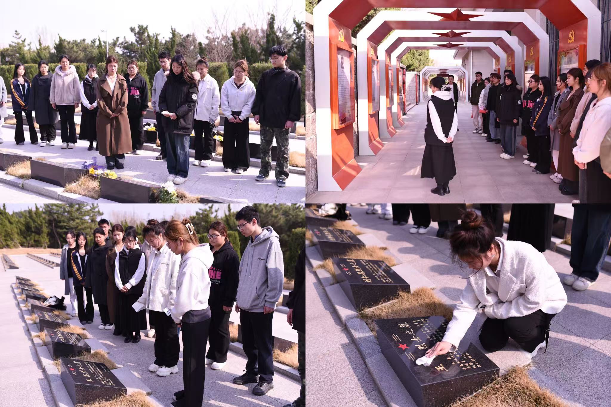 全体成员移步烈士墓区,用白布轻轻擦拭墓碑上的灰尘,从碑文镌刻的姓名、事迹中缅怀先烈。员工代表深情讲述青岛战役中“爆破英雄”王正同等烈士的壮烈故事,呼吁同学们要铭记历史,以革命先烈为榜样,树立理想,勤奋学习,为实现中华民族伟大复兴的中国梦贡献自己的力量。