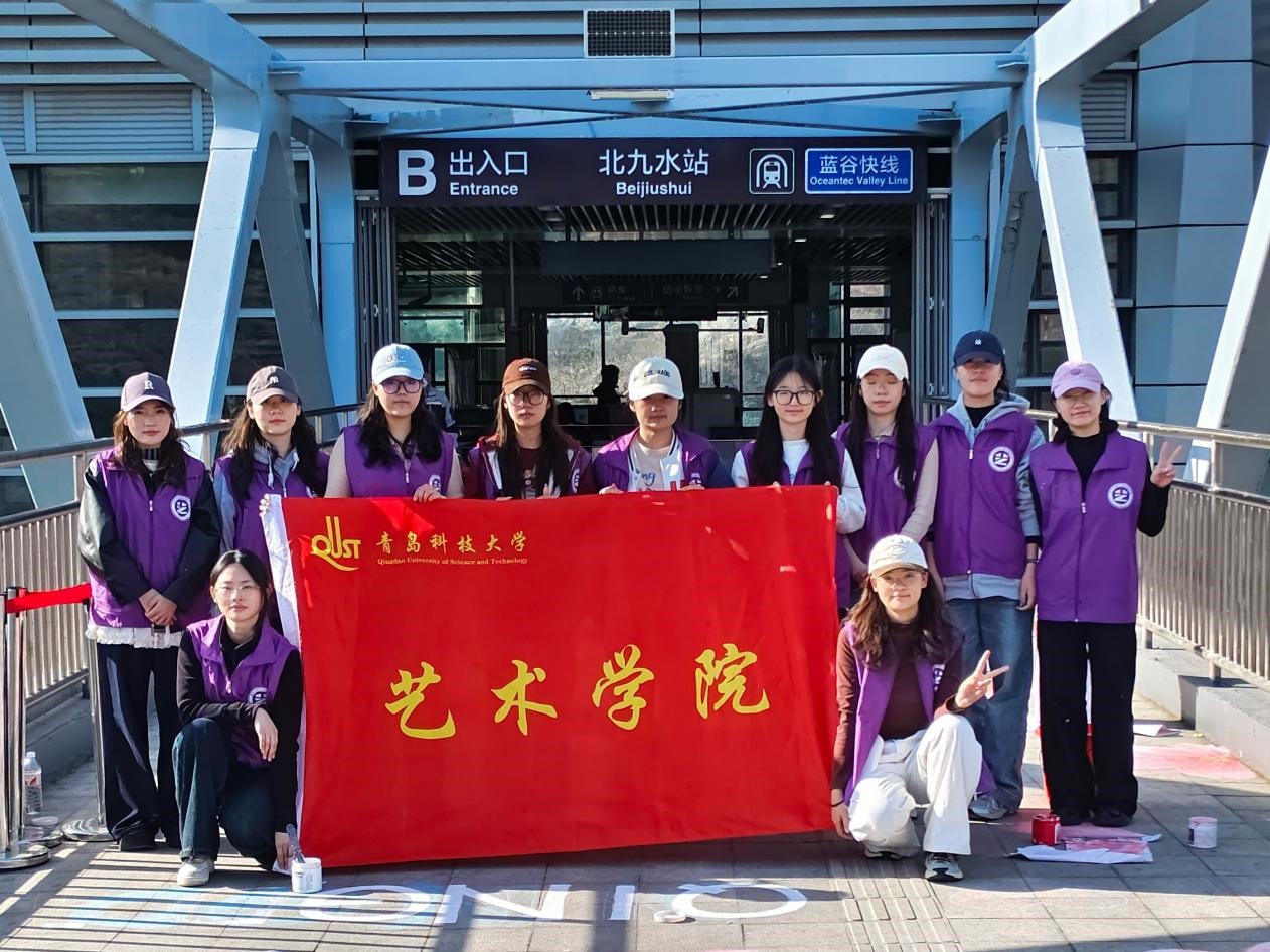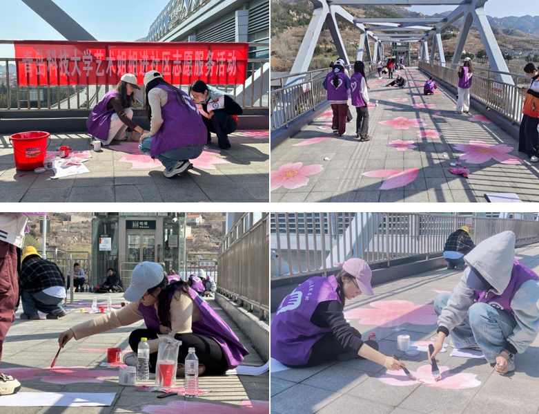 在北九水站外150余米的通道地面上,10余名环境设计专业团员青年执笔挥彩,以“樱舞春风”为主题,勾勒出樱花簇拥绽放的生动场景,辅以飘落的花瓣与灵动的枝蔓,形成“人在画中行”的视觉体验,吸引乘客驻足打卡,成为市民热议的“春日网红地标”。