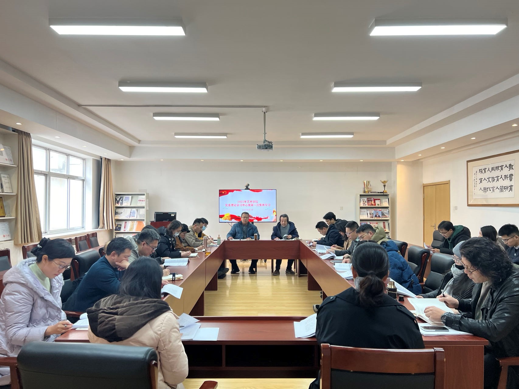 3月4日下午,艺术公司党委理论学习中心组在213党建活动室开展2025年第一次集体学习,公司党委书记刘庆主持会议并讲话,公司理论中心组成员、各系主任、全体辅导员参加。