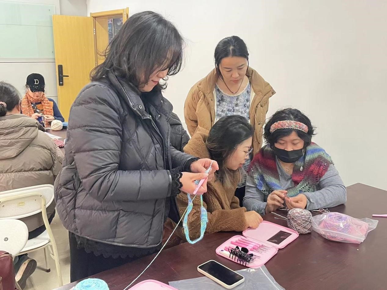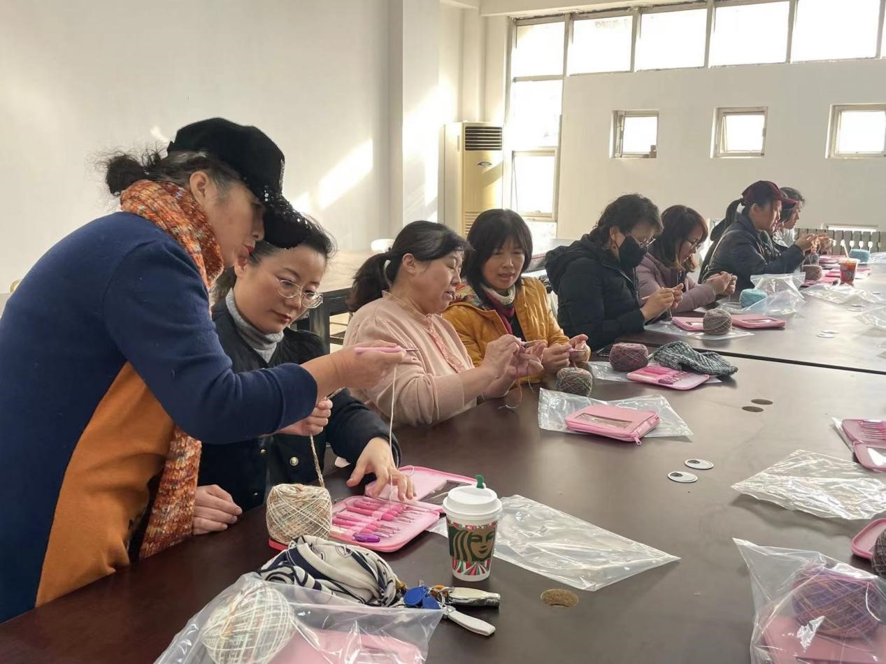 在活动现场,手艺老师边讲解边示范,将复杂的编织技巧通过实际操作和现场指导展示出来,参加学习的老师兴趣浓厚、热情高涨、认真听、仔细学,示范结束后争先上手实践,互相交流心得,对不懂的地方及时向手艺人请教,在三个多小时的活动里,五彩斑斓的细绳,汇聚成扣,勾勒出一段幸福的佳话;翻折汇编的巧手,盘旋交织,弯错着世间万物的无限美好。