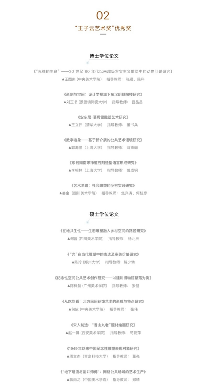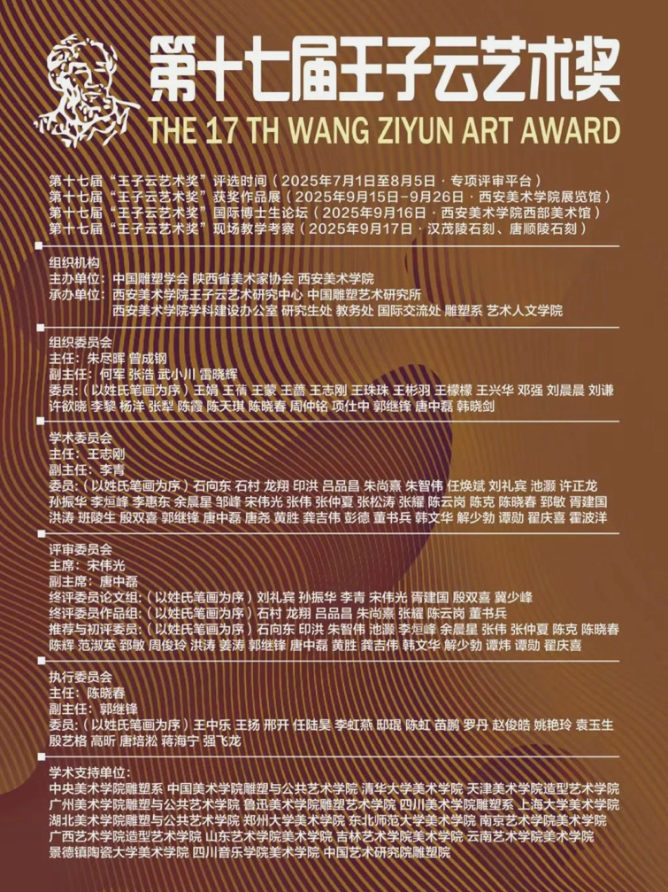 “王子云艺术奖”是2009年由中国雕塑学会、陕西省美术家协会、西安美术公司发起设立的全国性艺术奖项,以中国现代美术教育先驱、艺术考古开拓者王子云先生之名命名,它不仅奖励雕塑艺术创作,还奖励美术学雕塑艺术方向的优秀硕、博学位论文,是雕塑创作和雕塑史论研究的双项并举,具有实践与理论并重的学术导向。该奖项素以学术严谨性著称,尤其注重艺术创作的创新性、思想性以及对传统文化与当代语境的融合贯通。