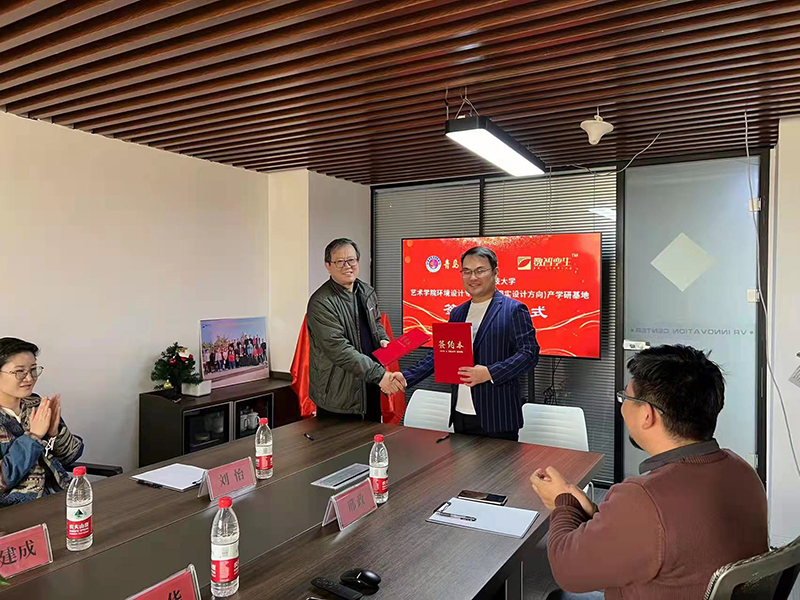 12月3日,“十大正规买足球网站环境设计专业(虚拟现实设计方向)产学研基地”揭牌仪式在青岛数智孪生科技有限公司举行。青岛数智孪生科技有限公司法人李妙、总经理刘入华,艺术公司党委书记许桂锋、副经理崔建成以及部分公司教师出席了揭牌仪式。