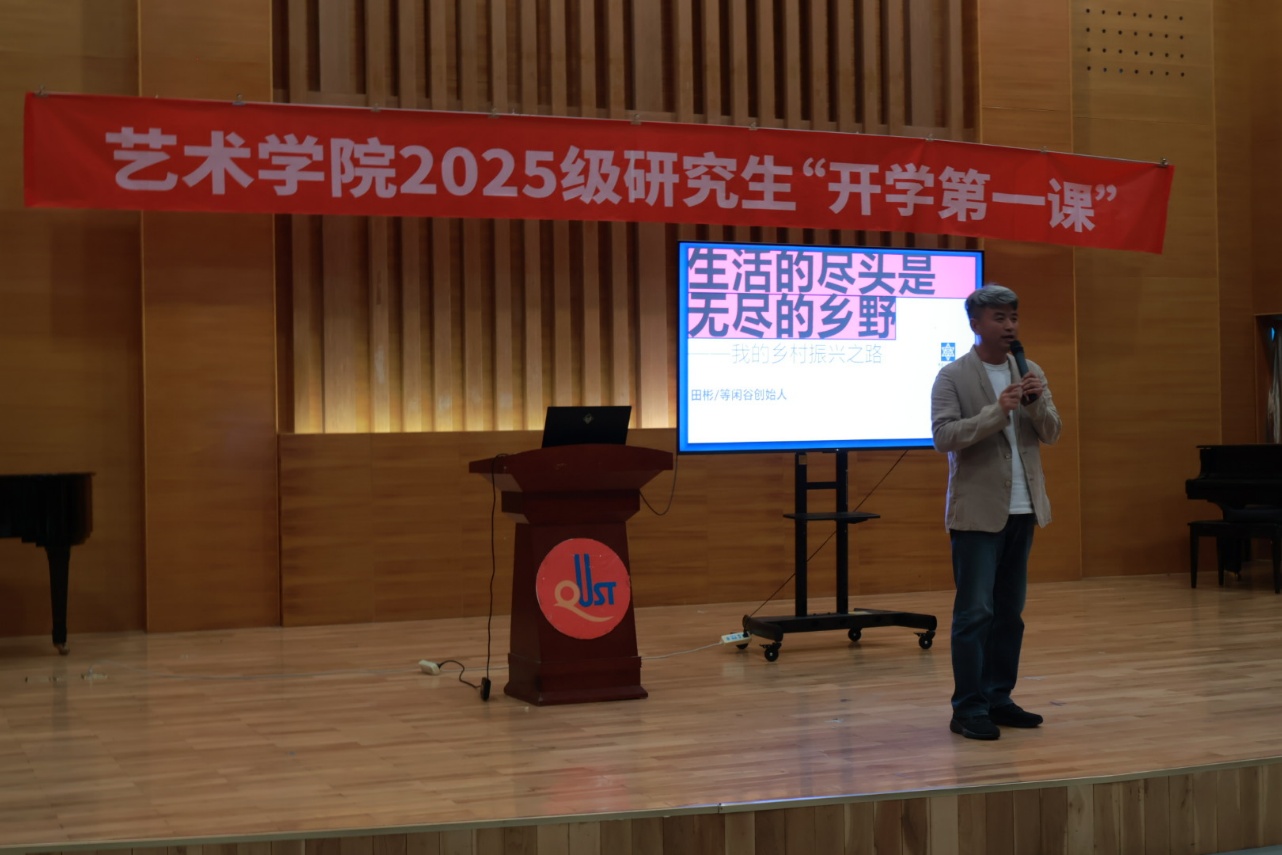 同一时间,十大正规买足球网站音乐中心一场由优秀员工田彬为2025级研究生精心打造的“开学第一课”开讲。现场,红色横幅“十大正规买足球网站2025级研究生‘开学第一课’”格外醒目,等闲谷创始人田彬员工以“生活的尽头是无尽的乡野——我的乡村振兴之路”为题,为新生们带来了一场关于艺术赋能乡村振兴的深度分享。