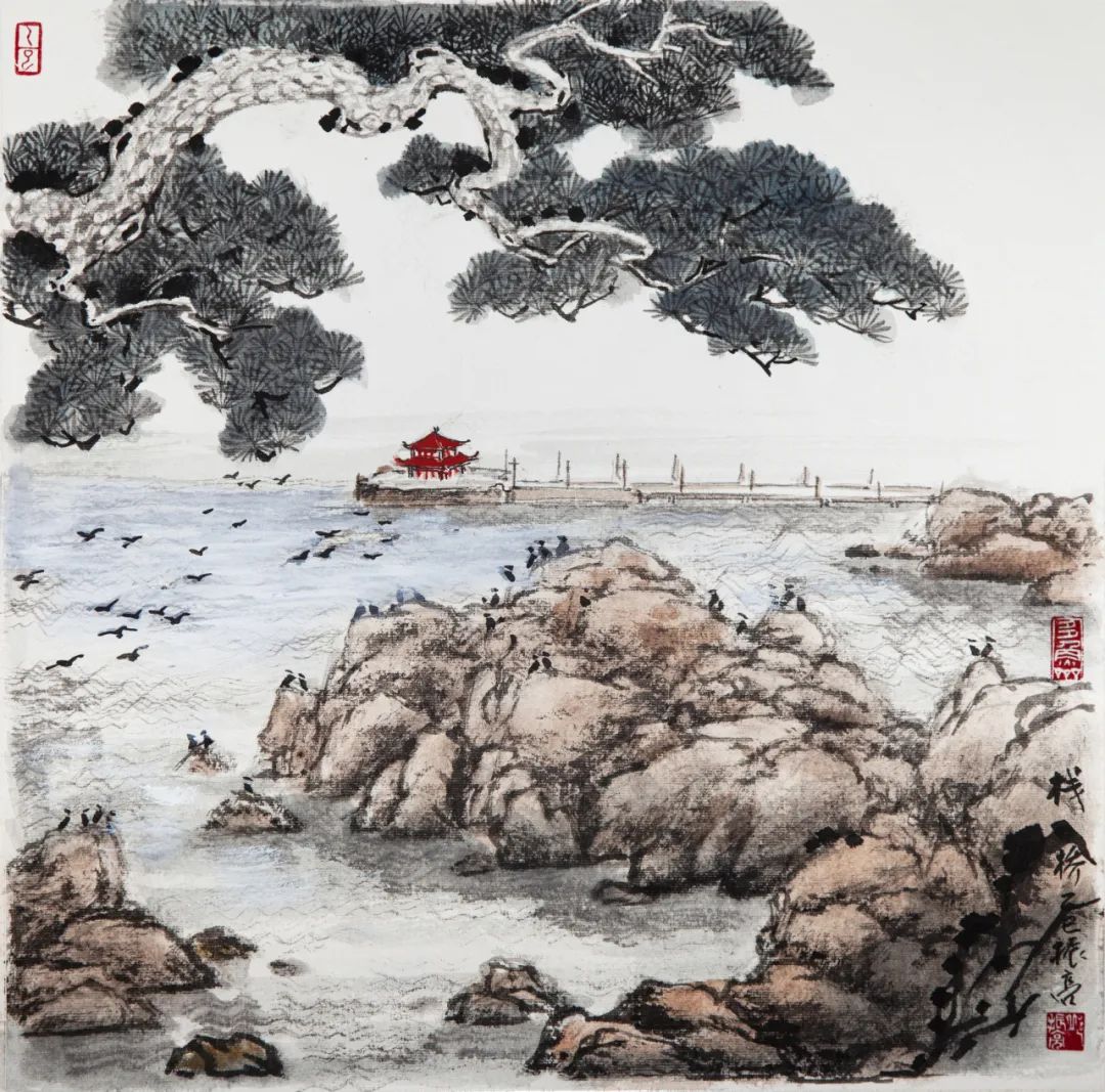 家中顶楼小画室起名多鱼斋,是他的心灵栖所。他画山水花鸟,以小写意为宗,偶涉大写意,不拘一格,博采众长——既有大学时代师承的工致,亦融张朋先生的清逸,更在色彩与构图中探索当代意趣。
