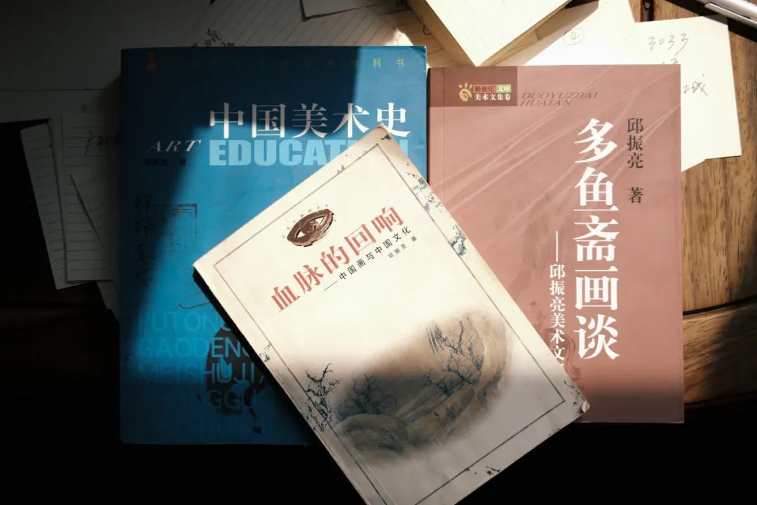 “教书、研究、画画,这辈子就做了这三件事。”邱振亮将教育置于首位。从四十一中学的青春讲台到科大经理的学术殿堂,五十余载春风化雨,弟子逾五千。“孩子们走到哪儿都记得我,这是最大欣慰。”研究是他的责任——教材铺路,地方史钩沉,参与国家百科工程,为学科筑基。画画则是初心所系,虽自嘲“晚集”,却在笔墨中完成了从史论家到艺术家的圆融。