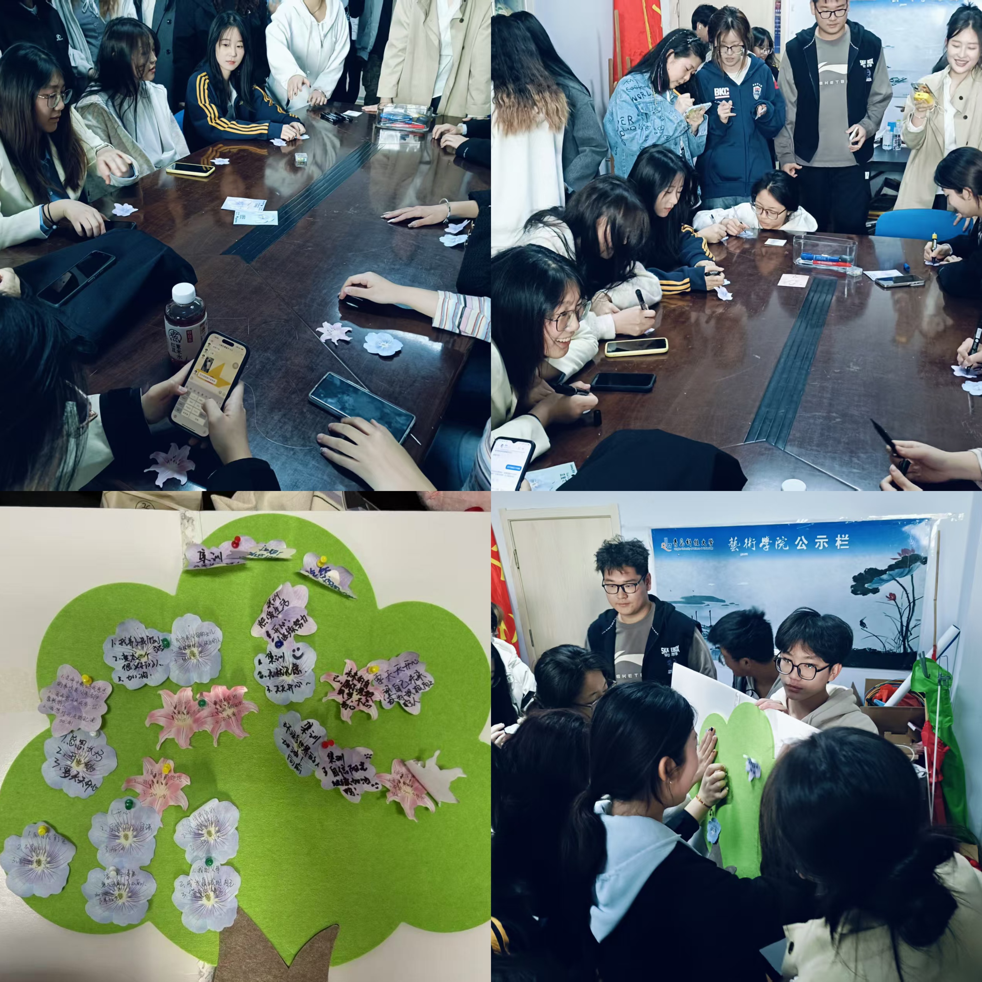 活动现场,气氛热烈而温馨。在“共绘生命树”环节,同学们领取花朵形状的便利贴,认真写下对生命中的感恩之事、对未来理想自我的期许以及对当下自己的寄语,随后将其粘贴在“生命树”展板上,每个人的心事都是一朵花,共同勾勒出一棵承载着心灵感悟的大树。大家还驻足观看他人的留言,感受不同视角下的生命思考。
